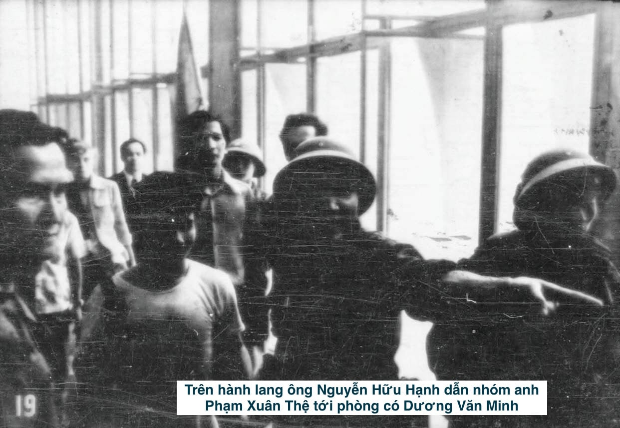 -Tấm ảnh chụp ông Nguyễn Hữu Hạnh dẫn nhóm anh Phạm Xuân Thệ ở hành lang, trên đường tiến vào phòng bắt Nội các Dương Văn Minh chứng tỏ lời ông Vũ Đăng Toàn nói sai sự thật khi kể ông Nguyễn Hữu Hạnh dẫn mình vào phòng “dồn nội các DVM” trước rồi mới thấy anh Thệ vào “Báo cáo Tổng thống”