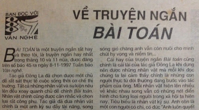 *“Bài toán là một truyện ngắn rất hay và theo tôi là hay nhất trong tháng 10 và 11 nữa, được đăng trên số báo 45 ra ngày 8-11-1997 Tuần báo Văn nghệ... Cái hay của truyện Bài toán cũng chính là cái tài của tác giả Đông La khi dựng lên được những nhân vật mà mỗi khi đọc chúng ta lại cảm thấy chính là những con người thực từ đời thường đang bước vào tác phẩm của ông... Cảm ơn tác giả Đông La đã viết nên một truyện ngắn mà tôi đọc thấy rất phù hợp với tôi và có lẽ nhiều người khác nữa. Câu chuyện quả có sức giáo dục và thuyết phục người đọc suy nghĩ và phải suy nghĩ sâu để cùng tìm ra những đáp số cần thiết cho "bài toán" thường gặp trong cuộc sống ...đến đây tôi khẳng định một lần nữa rằng Bài toán là một truyện ngắn hay, viết rất công phu. Tôi mong rằng Báo Văn nghệ của Hội Nhà văn sẽ cho ra đời nhiều những truyện ngắn độc đáo như thế...”